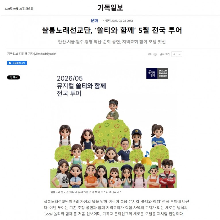 [기사] 샬롬노래선교단, ‘쏠티와 함께’ 5월 전국 투어(기독일보)