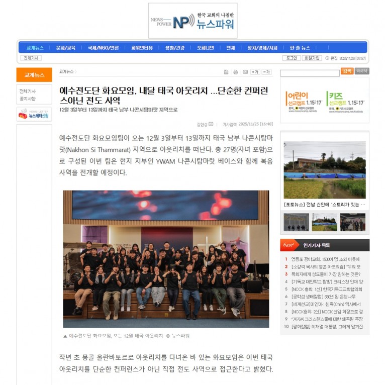 뮤직타임 [기사] 예수전도단 화요모임, 내달 태국 아웃리치 ...단순한 컨퍼런스아닌 전도 사역(뉴스파워)